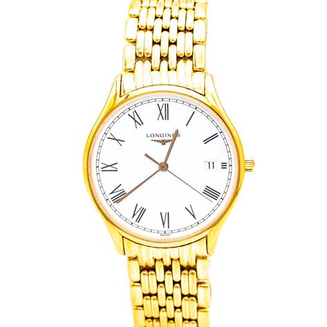 reloj Para Dama “longInes” *lyre* caja 35 mm y Pulso en acero DoraDo, carátula blanca, números romanos, movImIento cuarzo, serIe 31571xxx, gramos 78.9, estaDo De conservacIón satIsfactorIo