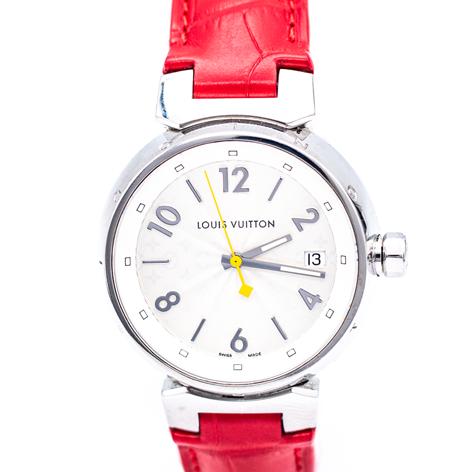 reloj Para Dama “louIs vuItton” *tambour* referencIa q1313 caja 34 mm en acero, Pulso PIel, carátula PlateaDa, números arábIgos, movImIento cuarzo, gramos 51.1, estaDo De conservacIón bueno