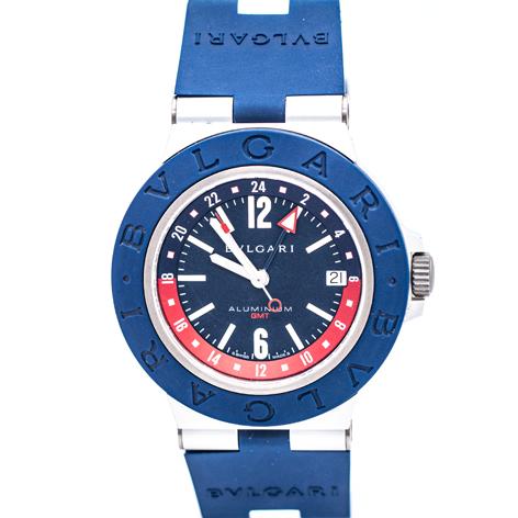 reloj Para caballero “bvlgarI” *bvlgarI gmt* referencIa bb 40 at gmt caja 40 mm y Pulso en alumInIo y caucHo, carátula azul, InDIcaDores mIxtos, gmt, movImIento automátIco, serIe bu1fxxx, calIbre b192, joyas 25, gramos 67.8, estaDo De conservacIón satIsfactorIo