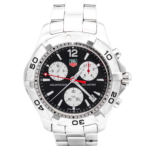 reloj Para caballero “tag Heuer” *aquaracer 300 m* referencIa caf1110 ba0804 caja 41 mm y Pulso en acero, carátula negra sIn cIfras, cronógrafo, movImIento cuarzo, serIe cm7xxx,agujas e ínDIces lumInescentes , cronometro, bIsel gIratorIo gramos 141.1, estaDo De conservacIón satIsfactorIo, (Pulso 16.0 cms.)