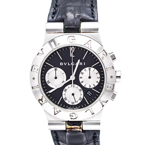 reloj Para caballero “bvlgarI” *DIagono* referencIa cH 35 s caja 35mm en acero, Pulso PIel (con rotura) carátula negra sIn cIfras, cronógrafo, movImIento cuarzo, serIe D21xxx, calIbre 1270, joyas 22, gramos 67.8, estaDo De conservacIón satIsfactorIo