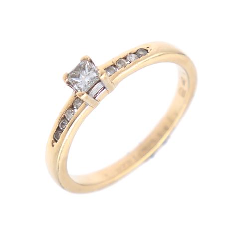 anIllo Para Dama oro amarIllo 14k, DIamante central talla PrIncess, 0.20 cts vs, I-k, brIllantes melee 0.08 ctw, meD. 6, gramos 2.2, calIDaD y Pesos aProxImaDos