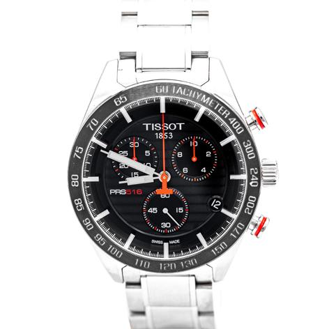 reloj Para caballero “tIssot” *Prs516* referencIa t100417 a caja 42 mm y Pulso en acero, carátula negra sIn cIfras, cronógrafo, movImIento cuarzo, serIe 7tu u03 xxx, gramos 164.5, estaDo De conservacIón satIsfactorIo, (Pulso 16 cms.)
