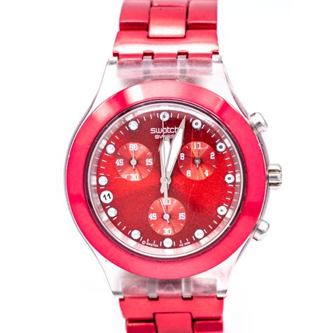 reloj Para caballero “swatcH” *DIaPHane* caja 43 mm en acrílIco y alumInIo, Pulso alumInIo, carátula roja sIn cIfras, cronógrafo, movImIento cuarzo, sIn número De serIe, gramos 62.2, estaDo De conservacIón satIsfactorIo