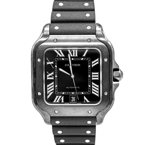 reloj Para caballero “cartIer” *santos* referencIa wssa0039 caja 49 mm en acero PvD, Pulso caucHo, carátula negra, números romanos, movImIento automátIco, serIe 41727xxx, calIbre 1847 mc, joyas 23, gramos 86.2, estaDo De conservacIón bueno, Pulso extra De PIel, accesorIo, estucHe y caja