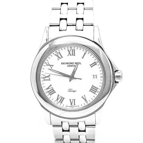 reloj Para caballero “raymonD weIl” *tango* referencIa 5589 caja 37 mm y Pulso en acero, carátula blanca, números romanos, movImIento cuarzo, serIe vI59xxx, gramos 114.2, Pulso 16.5 cms., estaDo De conservacIón satIsfactorIo
