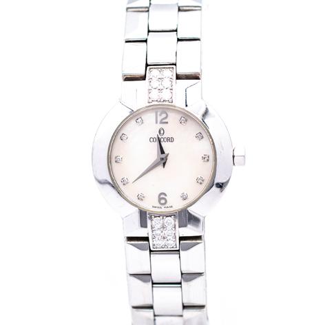 reloj Para Dama “concorD” *la scala* referencIa 14.ga.1843.s caja 26 mm con brIllantes y Pulso en acero, carátula maDre Perla, InDIcaDores De DIamantes, movImIento cuarzo, serIe 1070xxx, gramos 57.6, estaDo De conservacIón satIsfactorIo