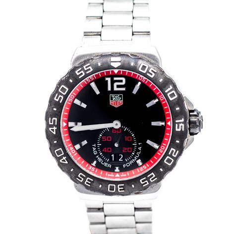 Heuer” *formula 1* referencIa wau1114.ba0858 caja 42 mm y Pulso en acero, carátula negra sIn cIfras, movImIento cuarzo, serIe ePz5xxx, calIbre 6004.b, joyas 5, gramos 146.4, estaDo De conservacIón satIsfactorIo (Detalle en brocHe)