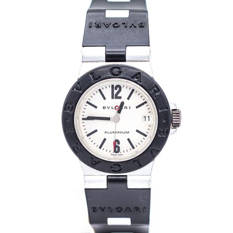 reloj Para Dama “bvlgarI” *alumInIum* referencIa al 32 a caja 32 mm y Pulso en alumInIo y caucHo, carátula PlateaDa con InDIcaDores mIxtos, movImIento cuarzo, serIe l 6xxx, gramos 45.8, estaDo De conservacIón satIsfactorIo