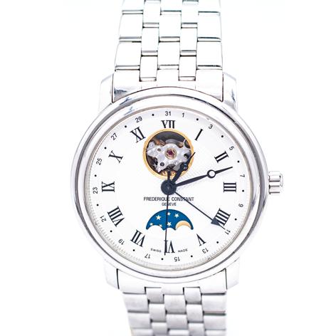 reloj Para caballero “freDerIque constant” *Heart beat* referencIa fc335mc4P/5/6 caja 40 mm y Pulso acero, carátula blanca, números romanos, fase lunar, movImIento automátIco, serIe 3376xxx, gramos 129.6, estaDo De conservacIón satIsfactorIo