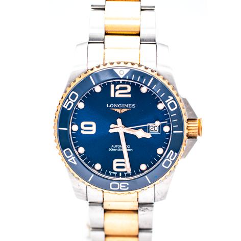 reloj Para caballero “longInes” *HyDroconquest* referencIa l3.781.3 caja 41 mm y Pulso en acero y acero DoraDo, carátula azul, números arábIgos, movImIento automátIco, serIe 54354xxx, gramos 172.0, estaDo De conservacIón satIsfactorIo, manual De usuarIo, garantía, estucHe y caja