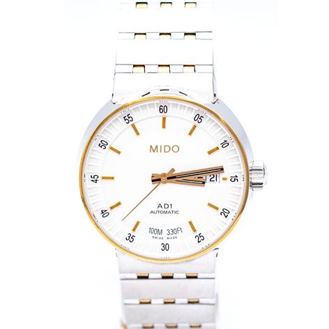 reloj Para caballero “mIDo” *aD1* referencIa 8338 caja 38 mm y Pulso en acero y acero DoraDo, carátula blanca, números arábIgos, movImIento automátIco, serIe 10454xxx, gramos 132.4, estaDo De conservacIón satIsfactorIo
