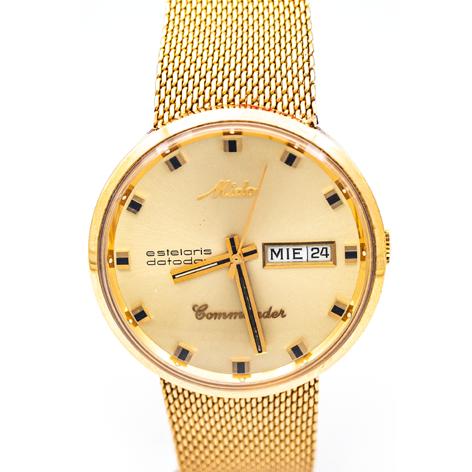 reloj Para caballero “mIDo” *commanDer” ref 8429b caja 37 mm y Pulso acero DoraDo, carátula DoraDa, InDIcaDores sIn cIfras, mov automátIco, estaDo De conservacIón muy bueno