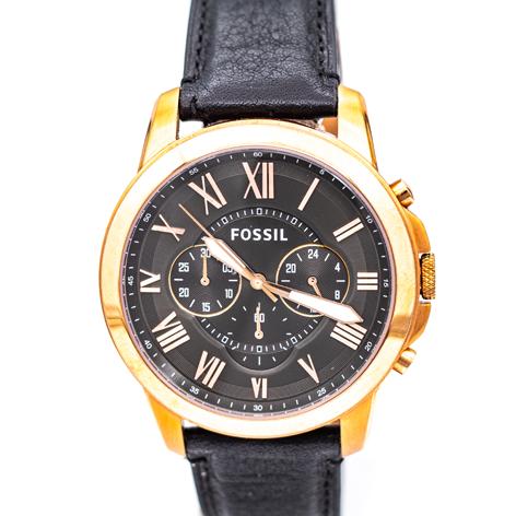 reloj Para caballero “fossIl” ref fs5085 caja 44 mm acero DoraDo y Pulso PIel, carátula negra, InDIcaDores números romanos, mov cuarzo, cronógrafo, estaDo De conservacIón bueno