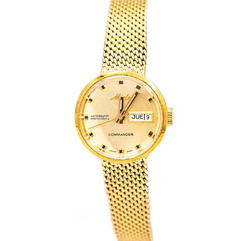 reloj Para Dama “mIDo” *commanDer* ref. 7169 caja 23.5 mm y Pulso acero DoraDo, carátula DoraDa, InDIcaDores sIn cIfras, mov automátIco, estaDo De conservacIón bueno