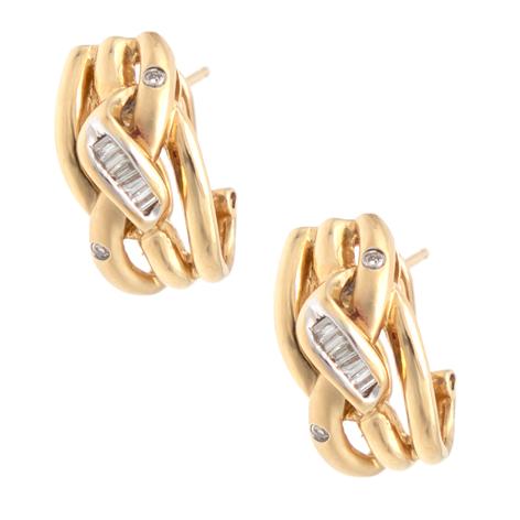 Par De arracaDas Para Dama confeccIonaDas en oro blanco 14k, con aPlIcacIones oro amarIllo aDornaDo con DIamantes melee 0.31 ctw, grs. 11.8. (2 DIamantes sueltos) calIDaDes y Pesos aProxImaDos