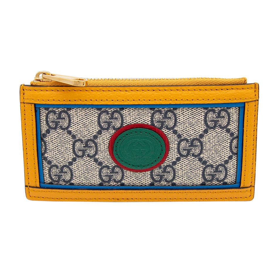 TarJeTero monedero para dama “GuCCI” exterIor en lona guccIssIma color azul marIno y café, bIeses amarIllos, tarjetero, logo De marca verDe con rojo, InterIor con zIPPer y textIl color rojo, Herrajes DoraDos, sIn cubre Polvo (buen estaDo De conservacIon) valIDaDo Por exPertos curaDores