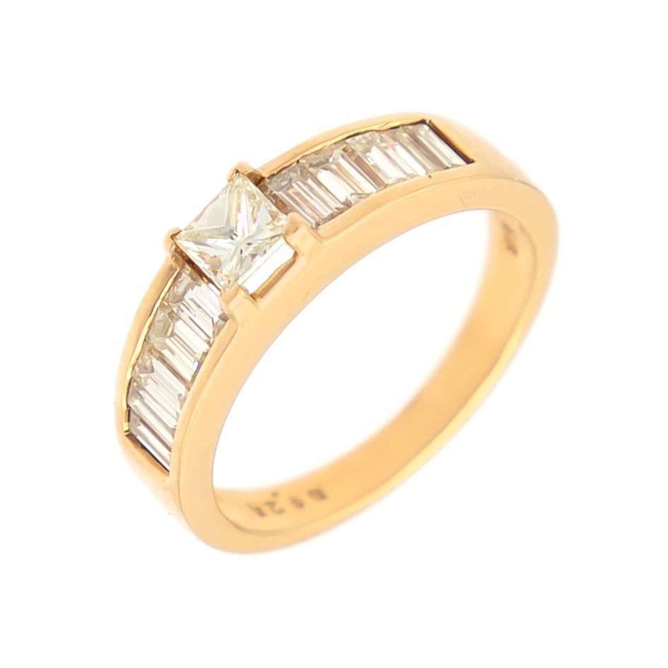 anILLo para dama confeccIonaDo en oro amarIllo 18k, DIamante central talla PrIncesa 0.35 cts vs/k-l, aDornaDo en brazos con DIamante baguette melee 1.00 ctw, meD. n° 6, grs. 4.2, calIDaDes y Pesos aProxImaDos.