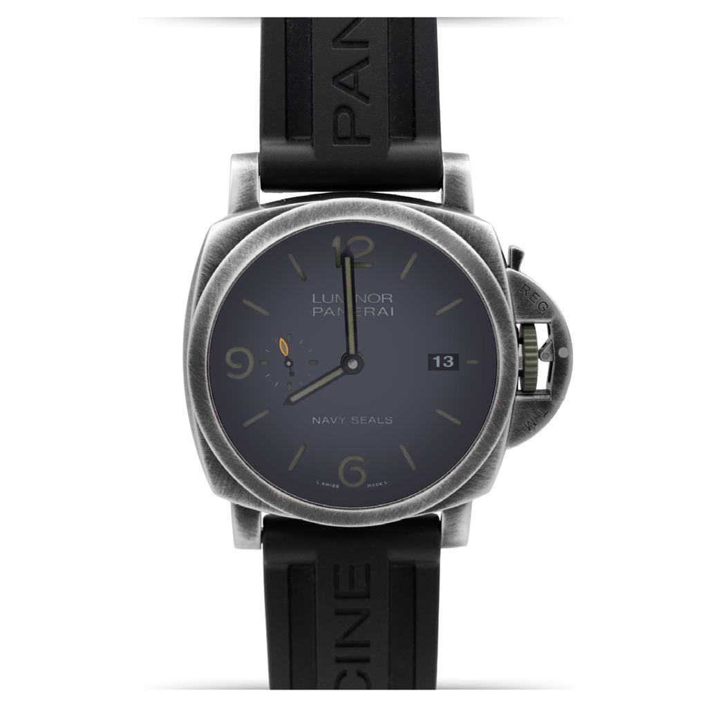 reLoJ para CabaLLero “paneraI” *LumInor marIna naVy seaLs* reF: pam01412 CIrCa 2023 caja 44 mm en acero PavonaDo, brazalete en caucHo, caratula grIs, InDIcaDores con barras y números arábIgos, mov. automátIco n° 165560, comPlIcacIones: fecHaDor, reserva De marcHa 72 Horas, serIe: oP7558bb2115xxx, cal: P.9010, joyas: 31, grs. 153.1,( Pulso extra textIl verDe con PIel, con bolsa De la marca e InstructIvo) eDo. De conservacIón: satIsfactorIo