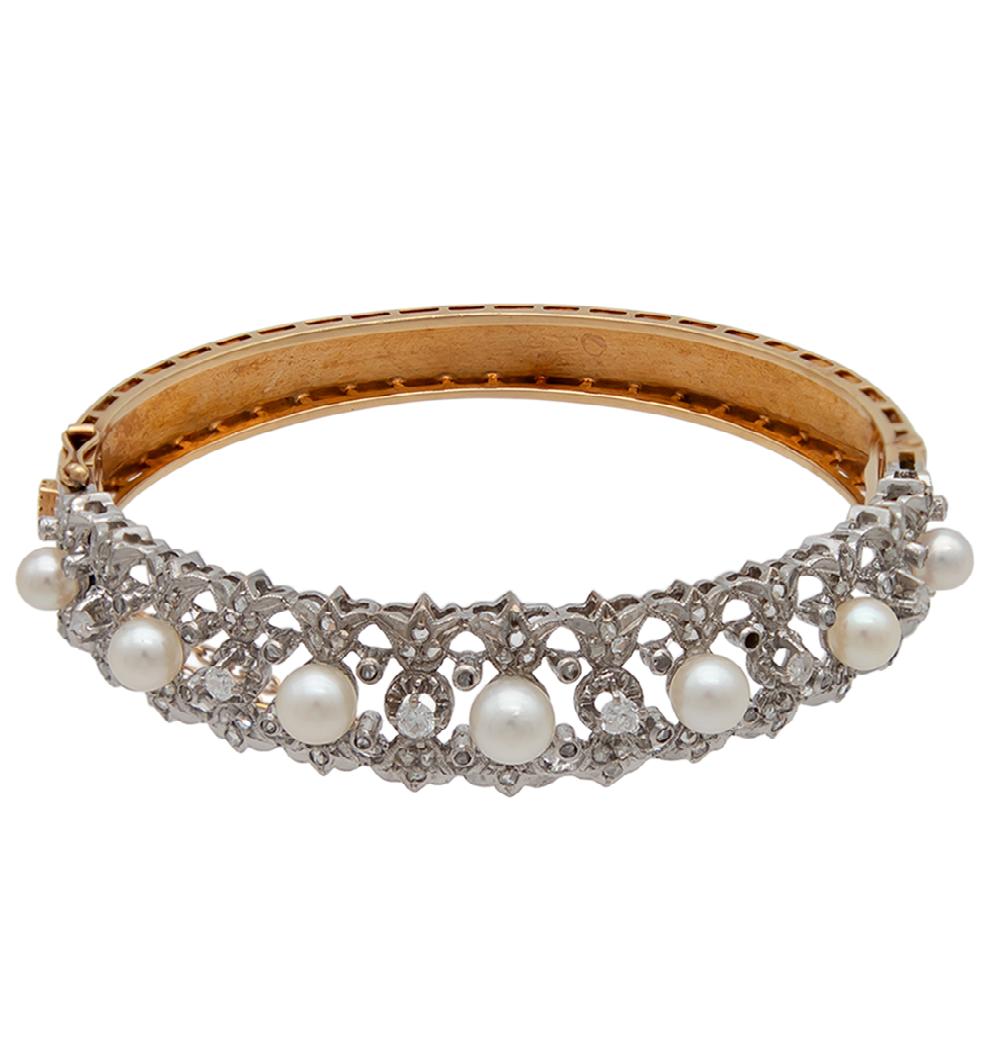 braZaLeTe para dama confeccIonaDa en oro amarIllo y blanco 18k, con 7 Perlas 4.5-5.8 mm, DIamantes tallas Irregulares 1.52ctw, con bIsagra y caDena segurIDaD ( faltan algunas PIeDras), cms. 17.0, gramos 30.6, calIDaD y Pesos aProxImaDos