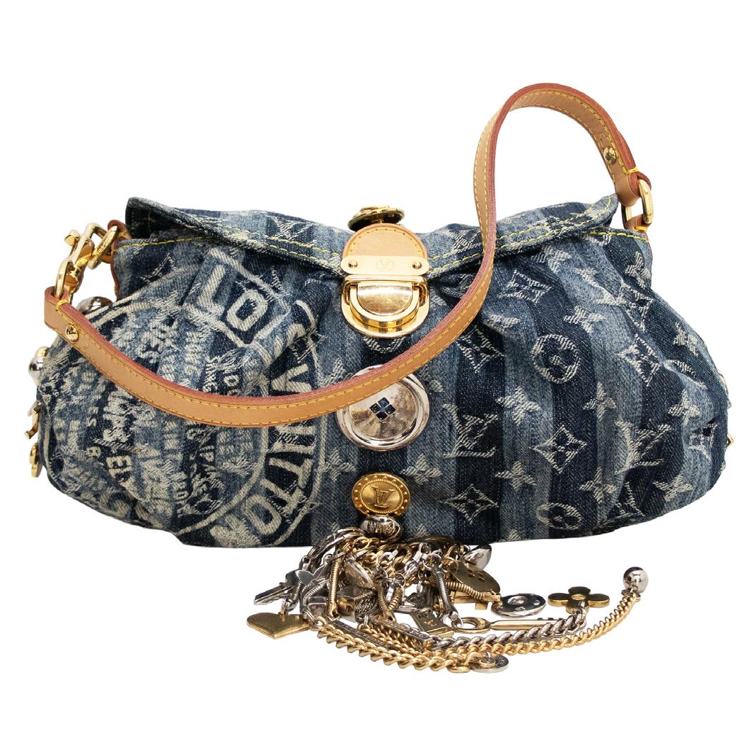 exterIor en mezclIlla color azul, asa al Hombro en cuero, con cHarms y botones De aDorno, InterIor en gamuza color mostaza, Herrajes DoraDos, con cubre Polvo, (buen estaDo De conservacIón) valIDaDo Por exPertos curaDores