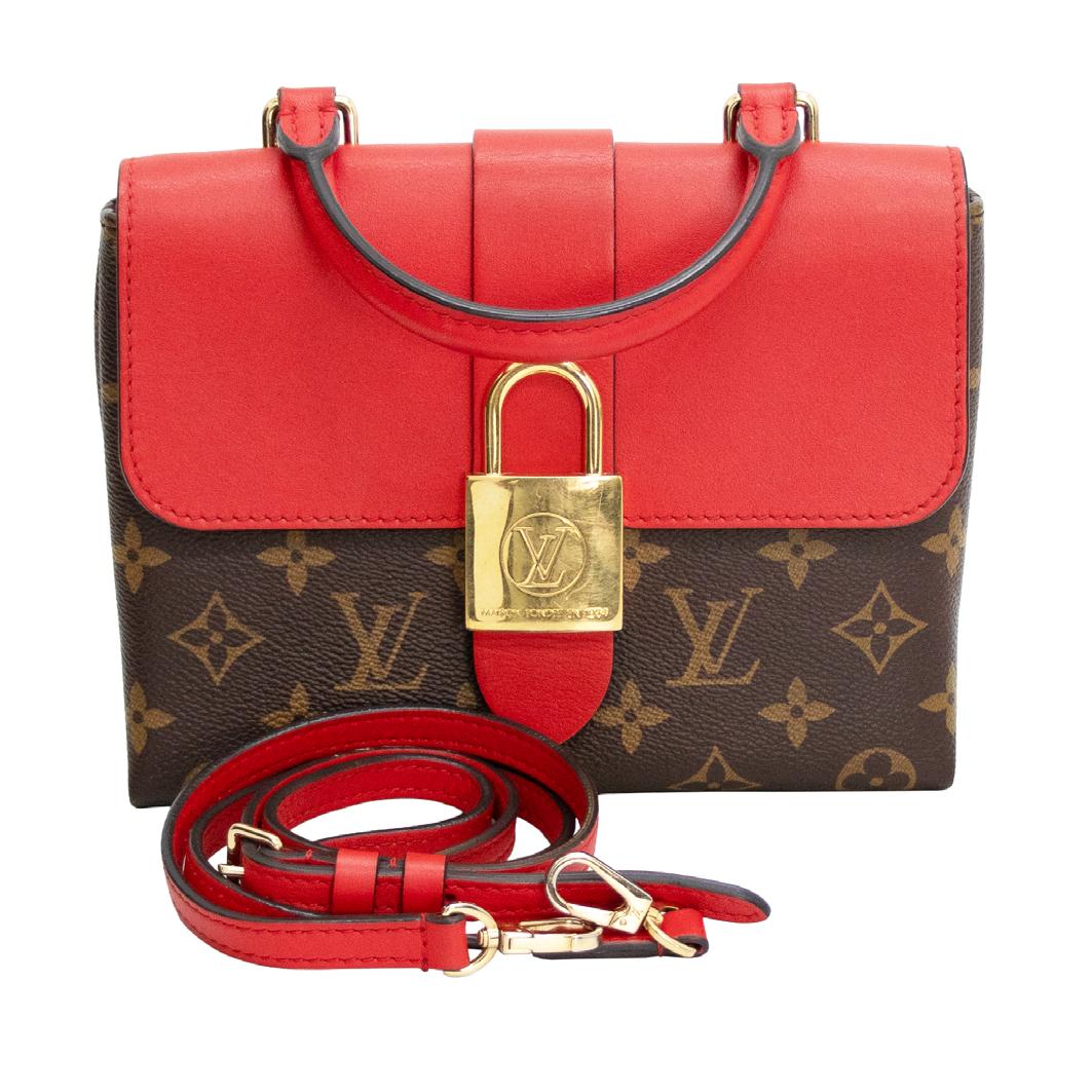 exterIor en lona monogram, asa corta y straP Desmontable y ajustable en PIel color rojo, brocHe De DIseño De canDaDo con logo De marca, InterIor en gamuza mIsmo color, Herrajes DoraDos, con cubre Polvo (buen estaDo De conservacIón) valIDaDo Por exPertos curaDores