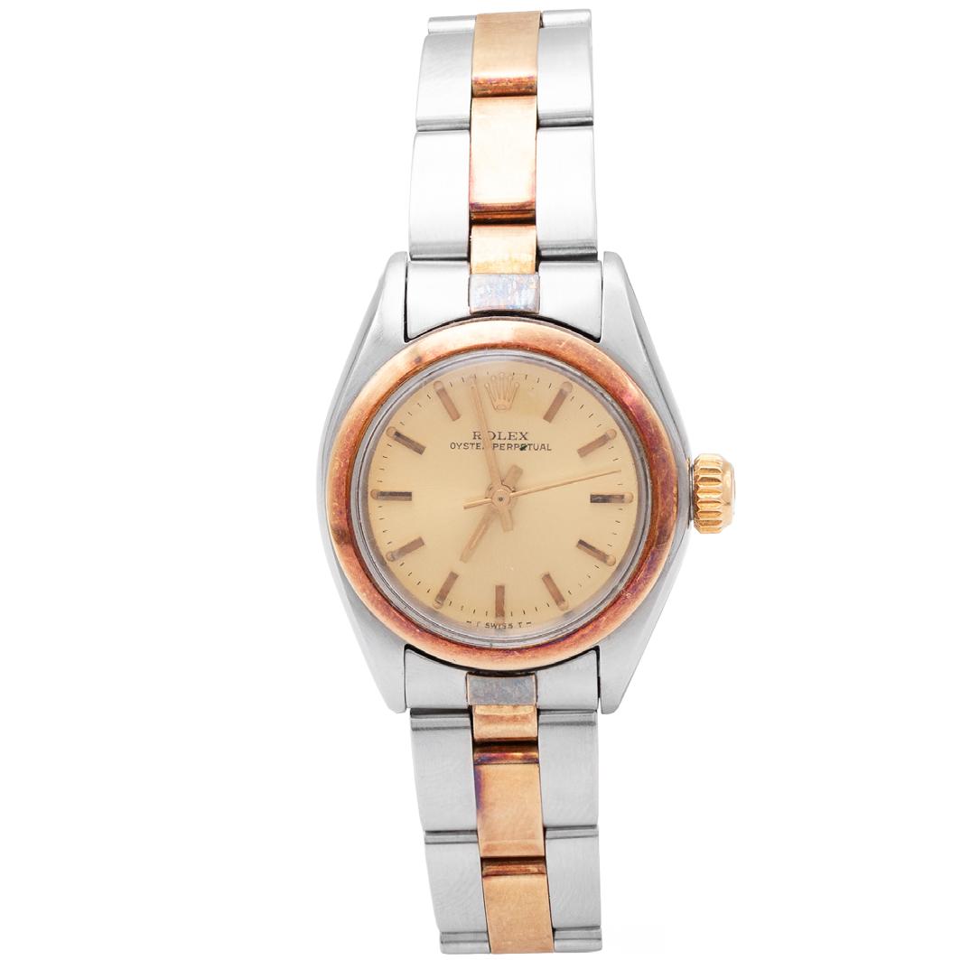 reLoJ para dama “roLeX” *Lady-oysTer perpeTuaL* CIrCa 1978, reFerenCIa 6718 caja 26 mm y Pulso oyster en acero y oro, caratula cHamPagne sIn cIfras, movImIento automátIco, serIe 5702xxx, calIbre 2030, no. De maquInarIa 814522, joyas 28, gramos 48.2, estaDo De conservacIón satIsfactorIo (Pulso 15.0 cms.)