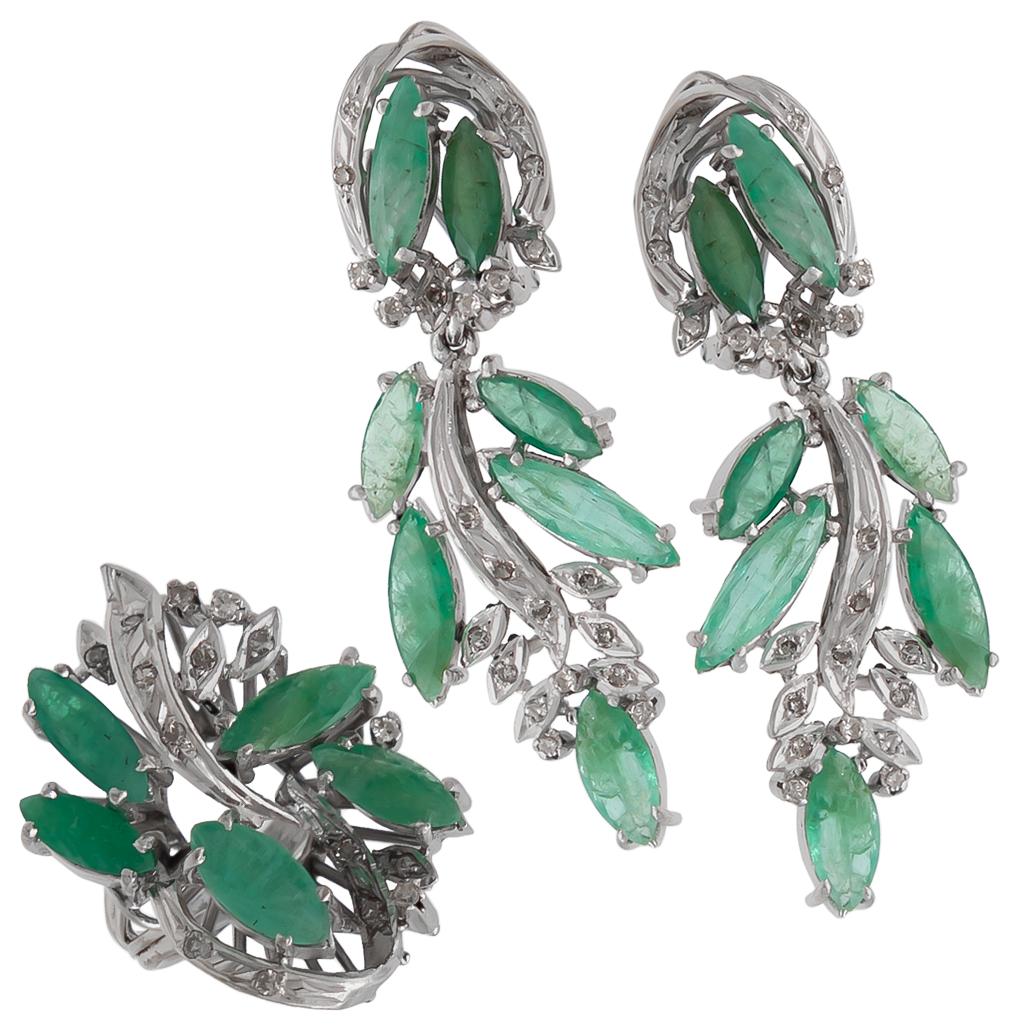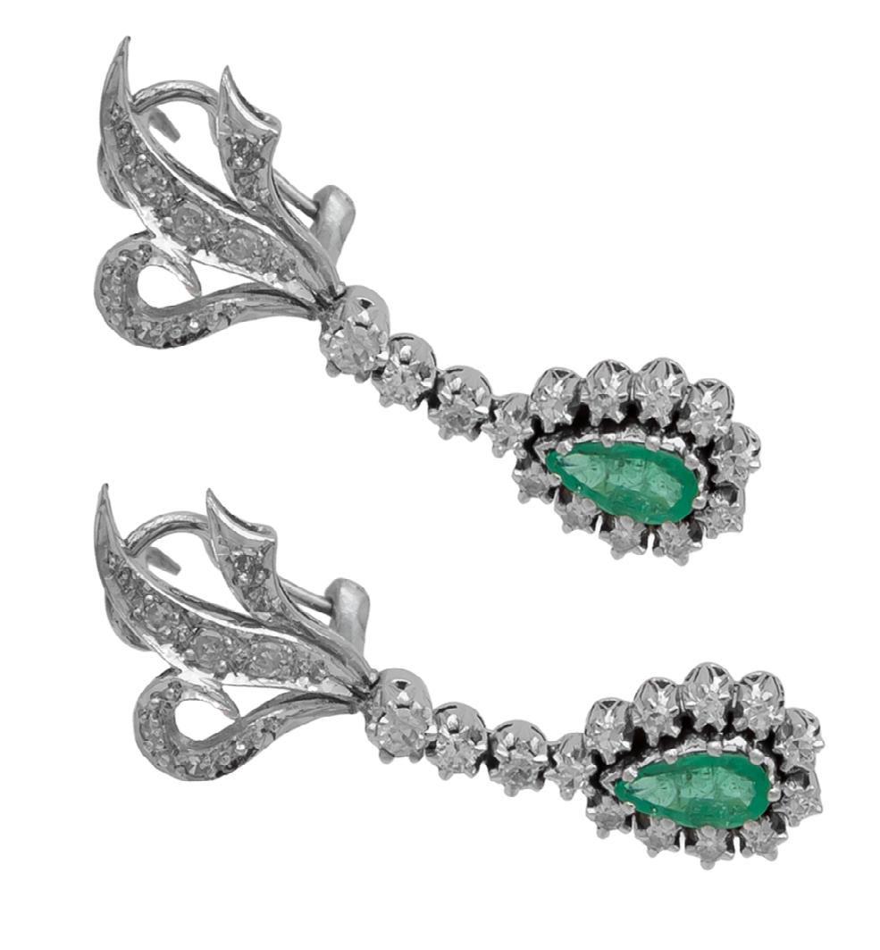 confeccIonaDos en oro blanco 18k, con esmeralDas talla gota 1.0 ctw (2x0.50) DIamantes melee 1.18 ctw, gramos 10.7, calIDaD y Pesos aProxImaDos