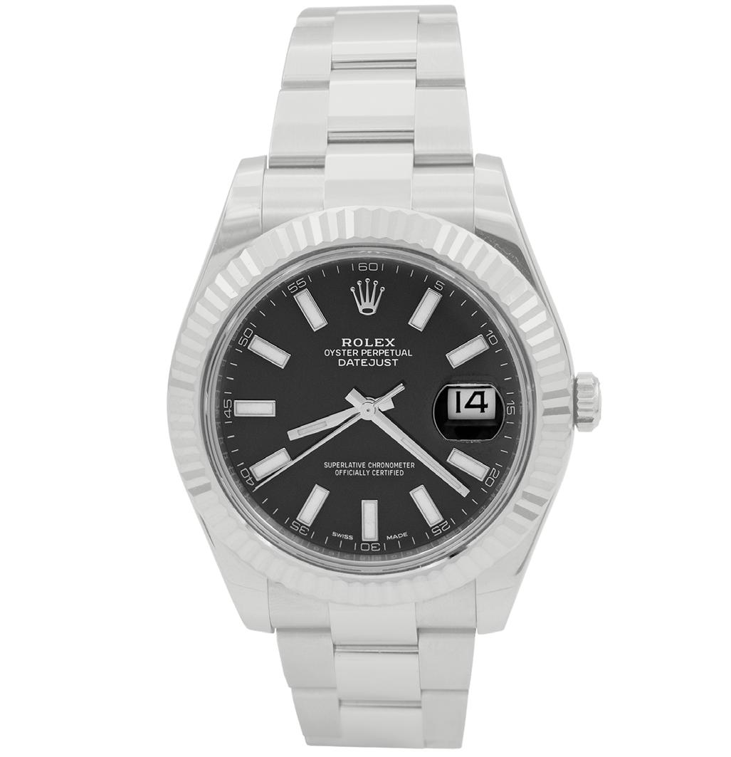 caja 41 mm y Pulso oyster en acero, bIsel estrIaDo oro blanco, carátula negra sIn cIfras, movImIento automátIco, comPlIcacIón: fecHaDor, serIe 86g48268, calIbre 3136, no. De maquInarIa q79g4361, joyas 31, gramos 152.1, con PaPeles garantía fecHaDa 2020, estucHe y caja
