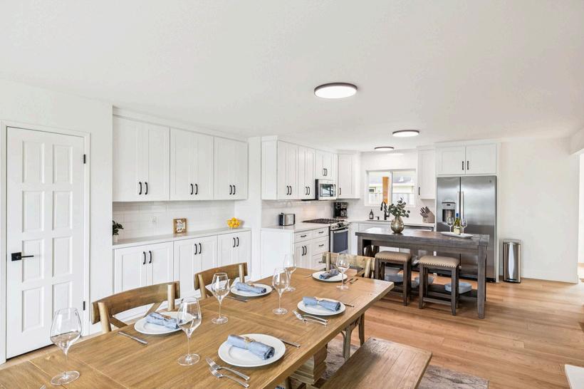 This light-filled space blends the family room, dining area, and kitchen into one inviting hub A cozy fireplace creates a warm backdrop, while abundant cabinetry and a movable island offer storage and versatility Whether set for dining, lounging, or entertaining, the open layout easily adapts to your needs
