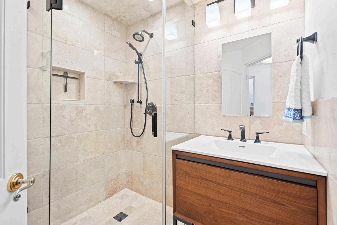 On the lower level, two additional spacious suites provide a welcoming blend of comfort and privacy Each bedroom comes with its own ensuite bath and direct access to the side yard terrace, perfect for extended stays, remote work, or personal getaways Large windows bring in abundant light and greenery, ensuring everyone enjoys a restful space with a touch of nature