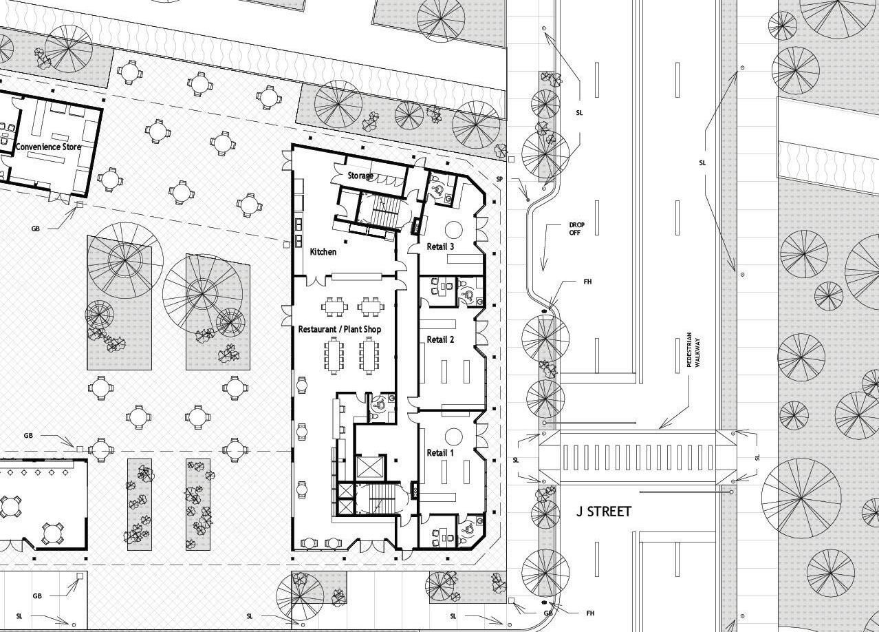 Ensure access from J street and the main pedestrian walkway. This can activate the storefronts for the mixeduse program. Meant to reflect the ideology of the larger site’s framework.