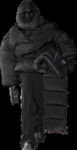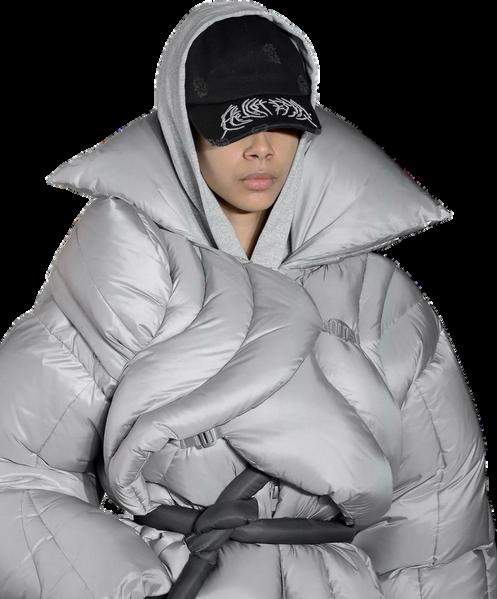 Las piezas de plumón transmiten una suavidad que complementan los tejidos de comprensión utilizados en tonos grises para crear diferentes dimensiones en una misma prenda, incluyéndolo en las fundas para botas.