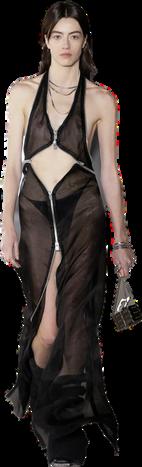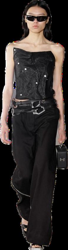 las transparencias y el uso del cuero sintético en algunas prendas Son siluetas transformadas con detalles asimétricos creando líneas de patrones orgánicos Diseñan formas extrañas en camperas, pantalones y vestidos como si fuera una escultura Éstas líneas asimétricas llegan hasta los bolsillos y las costuras