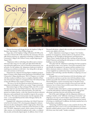 flat-panel televisions, a digital video recorder and a surround-sound system were added to the room. A pilot telepresence course began in August. Tom Sanders, professor of management, and his students are the pioneers of this technology in the Principles of Management and Organization Theory course. Sanders divides the class, teaching one group in the Global Classroom and sending the other group to a class in the same building to test the technology. “Our pilot with the telepresence technology has been exceptionally successful to date, in my opinion. I have been surprised by how user-friendly the equipment is to operate and how seamless it is to deliver classroom content at a distance. I have also been surprised at how insightful our students have been concerning the potential benefits of this technology and their flexibility in adapting to its use,” Sanders said. Although there are some limitations with this technology, such as test delivery and one-on-one face time with the professor, many students may prefer this method to many distance-learning courses. Deanna Blackerby, a junior accounting major in the pilot course, commented “It is not the same as being in the actual room with the instructor, but it is better than an online course where no contact with the instructor is received.” Another student, Jesse Squires, a senior management major, said, “I find the teleconference classroom highly effective. The greatest advantage is growing class sizes and reaching more people.” One of the major challenges with the telepresence delivery, according to Sanders, is the “difficulty in letting go of yesterday” and adapting to new ways to teach students. Instructors have to modify traditional methods, such as using PowerPoint presentations instead of writing on a chalkboard. In addition, the faculty member has to be both producer and professor. “Technology-enabled learning is a clear trend for the future. We can either learn how to use it or we can be left behind as our technologically enabled students connect with other educational institutions that better meet their needs,” Sanders concluded.