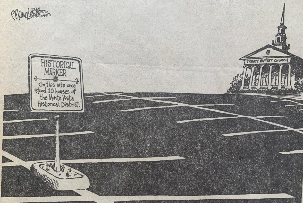 One of the many cartoons published in the local papers during Monte Vista’s campaign to save houses from demolition. The homes along East Mulberry were torn down for Trinity Baptist Church’s parking lot.
