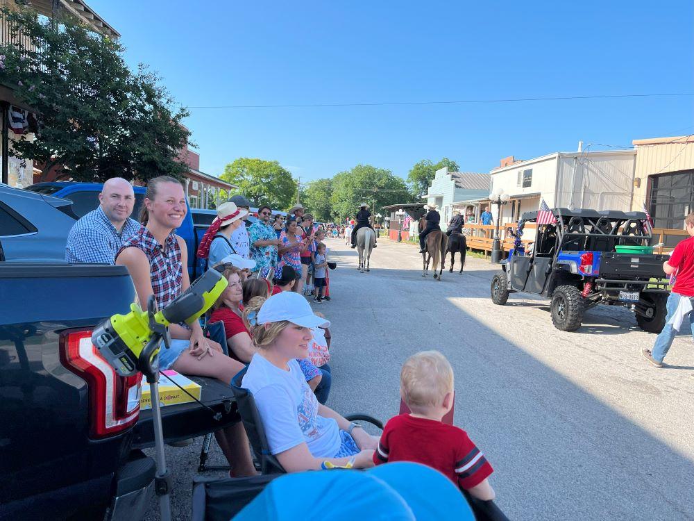 The parade lasted about 15 minutes, with fewer numbers of participants this year, but spirits were high The Montgomery County Jeep Soc ty ad rge contingentofJeepowners drivingthrough, wellas oth r org n za i ns Many parade goers found shade from buildings on