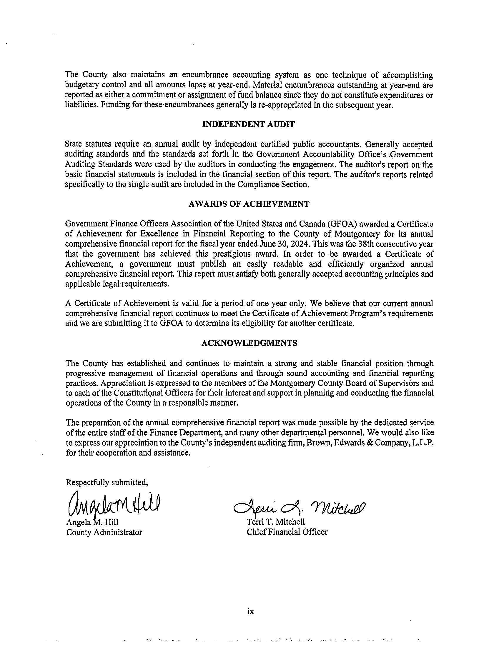 We are pleased to present to you the Annual Comprehensive Financial Report (ACFR) of the County of MontgomeryforthefiscalyearendedJune30,2025,asrequiredbystatelaw.Thefinancialstatementsand supplementalschedulescontainedhereinhavebeenauditedbytheindependentcertifiedpublicaccounting firmofBrown,Edwards&CompanyL.L.P.,andthefirm’sunmodifiedopinionisincludedintheFinancial Section of this report. Responsibility for both the accuracy of the data, and the completeness and fairness of the presentation, including all disclosures, rests with management. To the best of our knowledge and belief,theencloseddataisaccurateinallmaterialrespectsandreportedinamannerthatpresentsfairlythe financial position and results of operations of the various funds and component units of the County. All disclosuresnecessarytoenablethereadertogainanunderstandingoftheCounty’sfinancialactivitieshave beenincluded.