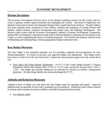 ECONOMIC DEVELOPMENT Division Description The Economic Development Division serves as the primary marketing resource for the County and two towns to generate taxable capital investment and meaningful job creation. The Board of Supervisors has adopted a long-range Economic Development Strategic Plan to guide and focus resources. The plan outlines five major program goals: recruitment of new industry, retention and expansion of existing business and industry, market research, workforce development and product (sites and buildings) development. The division works closely with the Economic Development Authority, Economic Development Commission, and the MBC Development Corporation serving both as staff and partners in attracting new investment to the County, as well as supporting the success of existing businesses. The Division also partners with the towns of Blacksburg and Christiansburg to develop appropriate business inside the towns.