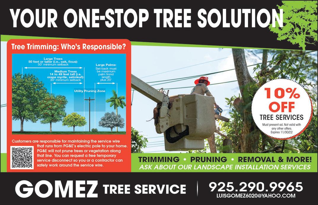 The Monthly Grapevine ™ Delta OCTOBER 2022 21TO ADVERTISE CALL 925-634-0880 • Landscape Plans • Dry Creekbeds • Patios • Clean-up • Sod & Synthetic Lawns • Sprinkler • Tree Pruning • Fences • Drip System • Pavers • Retaining Walls • Concrete Demo LICENSE #784035 • BONDED & INSURED FREE Estimates! 925-240-6311 • 1555 Eden Plains Rd, Brentwood • Palm Trees • Fruit Trees • Shade Trees • Roses • Citrus • Succulents FULL SERVICE LANDSCAPING & NURSERY NURSERY BEARSCAPES WE SELL SOD! JUST $0.69 SQ FT. WE SELL FIREWOOD! 40% OFF ALL STATUES & CERAMIC POTS YES! WE’RE OPEN EVERYDAY! YES! WE’RE OPEN EVERYDAY! Hours: Monday - Sunday 9:00am-4:30pm With coupon. Only to be used on non-discounted merchandise. 10% OFF Beautify YOUR YARD HAPPY LANDSCAPE & CONSTRUCTION • 925-752-0375 Lic #982294 • Concrete (All Types) • Walkways • Patios • Driveways • Retaining Walls • Brick Work• Fencing • Patio Covers • Synthetic Turf • Tree Service • Rock Garden • Decks • Pavers • Flagstone • Drainage Systems • Sprinkler & Drip System (Inst. & Repair) • Yard Clean-up • Hauling • And More!Quality Work at Low Prices 15% OFF Any Service with this ad. Must present ad. Expires 11/30/22. FREE ESTIMATES Interior • Exterior • Repaints Free Estimates Jared Cuevas BayValleyPaintingInc@gmail.com CA Lic. #1016730 $40 OFF Not valid with any other offer. Limited time offer. 925-804-1910 • Free Estimates 29 Years Experience & Over 4000 Homes We Also Offer Cabinet Refacing Cabinet Restoration Services Cabinet Restoration Services Beautiful Cabinets Without Buying New
