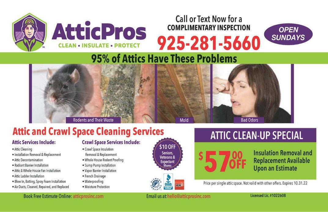 18 The Monthly Grapevine ™ Delta I OCTOBER 2022 MonthlyGrapevine.com “Class Act”Cleaning Services 925-706-7572Insured & Bonded Hospital Grade Disinfectant Regular Maintenance One Time Cleanings Move-In/-Out Cleanings Office Cleaning Window & Blind Cleaning SPECIALTY SERVICES: New Screens • Rescreening Pet Resistance Screens classacthousecleaning.com Servicing Your Area for Over 25 Years 10% OFF House & Window Cleaning Special Call for details • Exp.11/30/22 Gift Certificates Available! Call for specials The Perfect Gift Super discounts for multiple services Housecleaning USING ALL THE SAFE PROTOCOLS WE CLEAN SO YOU DON’T HAVE TO! $500 OFF Any New System For a Limited Time Only $45 OFF Repair Services New Clients Only FREE Air Duct Cleaning with Any New System For a Limited Time Only 925.690.1274