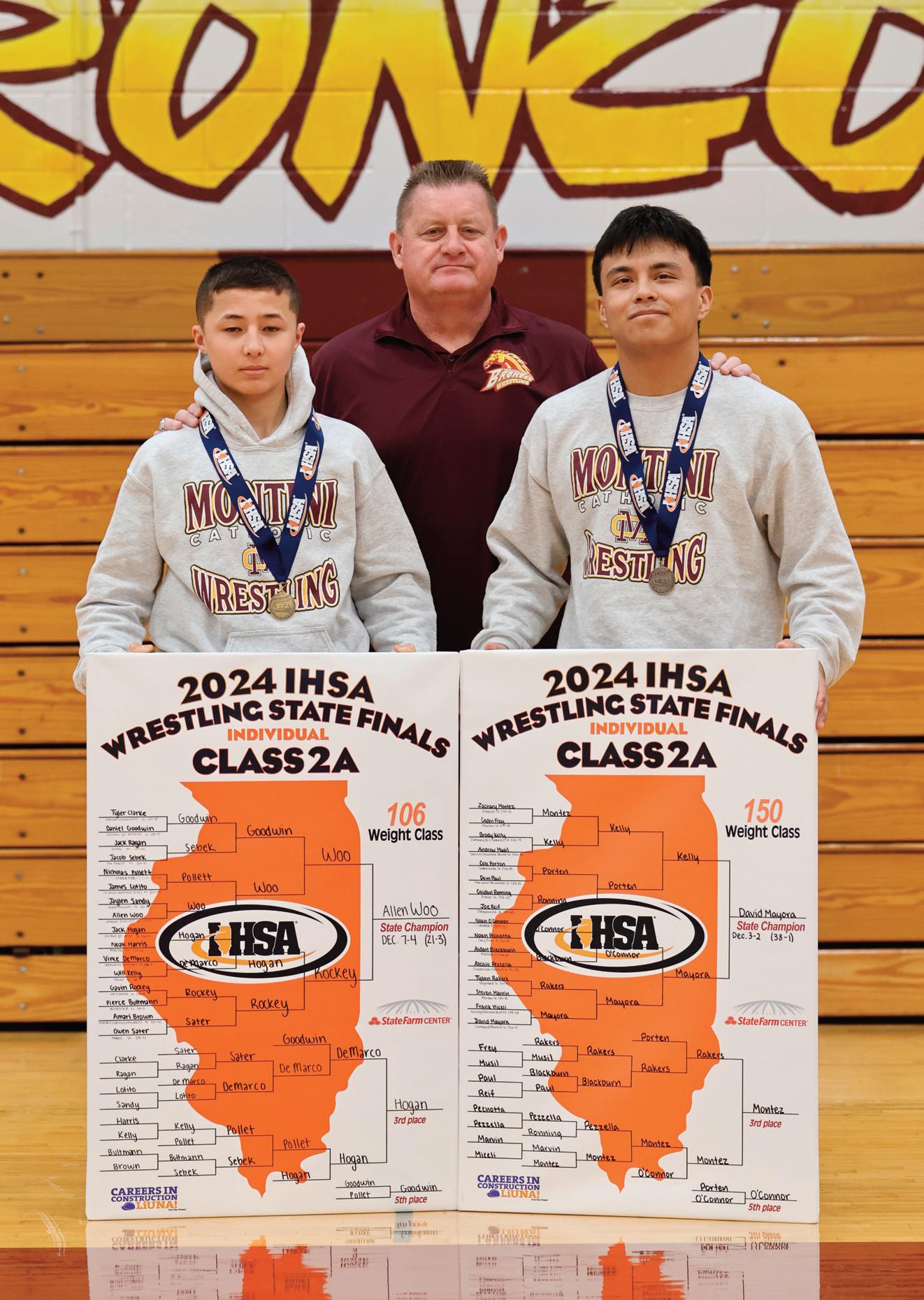 After finishing the regular season with a glittering 24-2 record, the Broncos continued their dominance in the post season by winning the IHSA Regional Tournament, and advancing 12 wrestlers to the IHSA Individual State Tournament, including Allen Woo ‘27, Mikey Malizzio ‘27, Isaac Mayora ‘27, Josh Vazquez ‘25, Kam Luif ‘26, Jeremy Huf ‘26, David Mayora ‘24, Harrison Konder ‘24, Santino Tenuta ‘26, Alexander Tack ‘26*, Jaxon Lane ‘25, and Mick Ranquist ‘24. Turning in All State performances for Montini were Mikey Malizzio (3rd @ 113 lbs), Josh Vazquez (2 nd @126 lbs), Kam Luif (3rd @ 132 lbs), and Harrison Konder (3rd @ 157 lbs). Allen Woo (106 lbs), and David Mayora (150 lbs), made Bronco history by being crowned the 69th and 70th IHSA Individual State Champions in the long and storied history of Montini Wrestling, after having dominating tournaments.