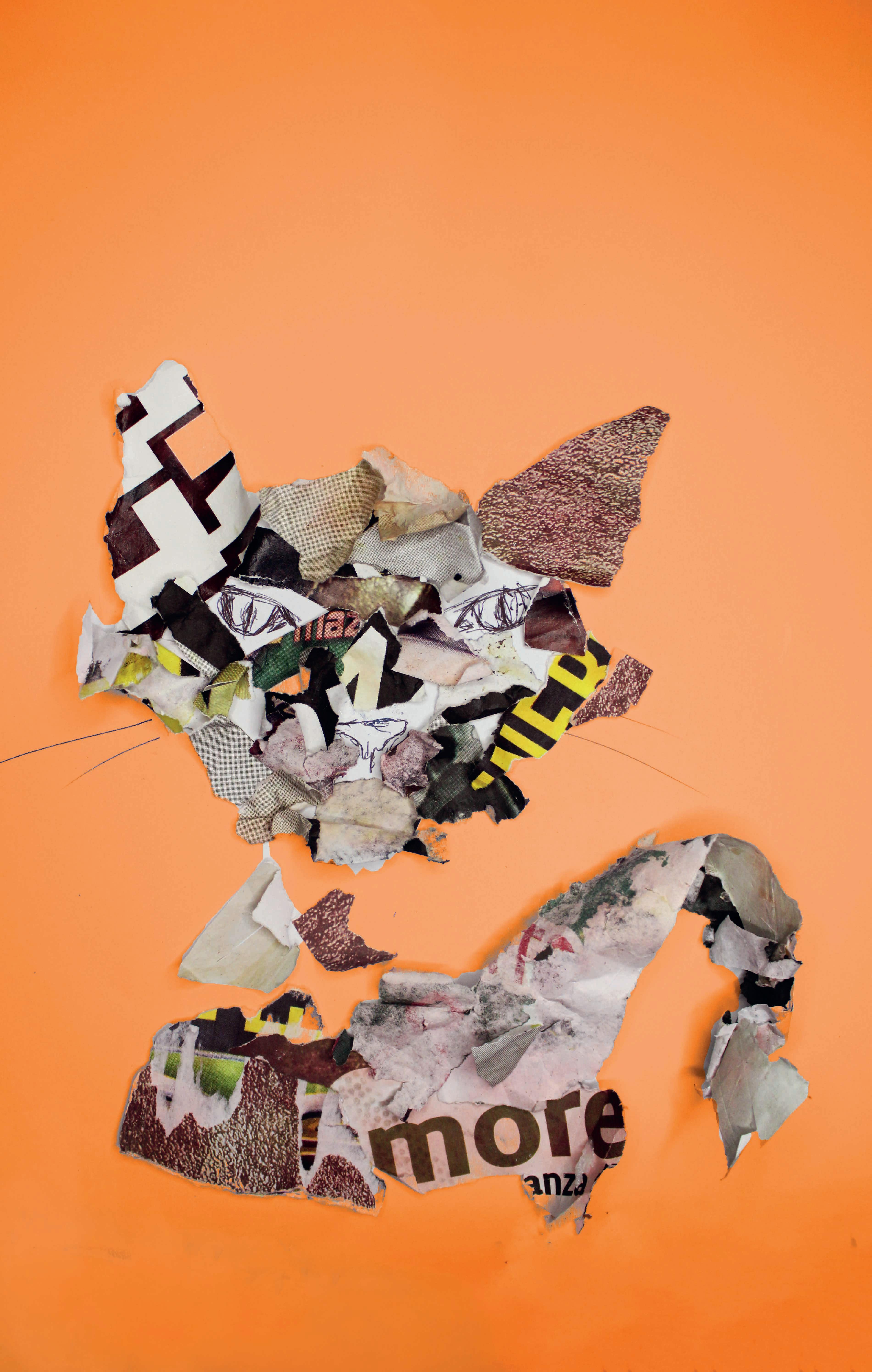 Yo el gato fue el libro que se le hizo un re-diseño ficticio de la portada con la técnica llamada decollage, solo con puros trozos de papel reciclado rasgado y con intervención de bolígrafo.