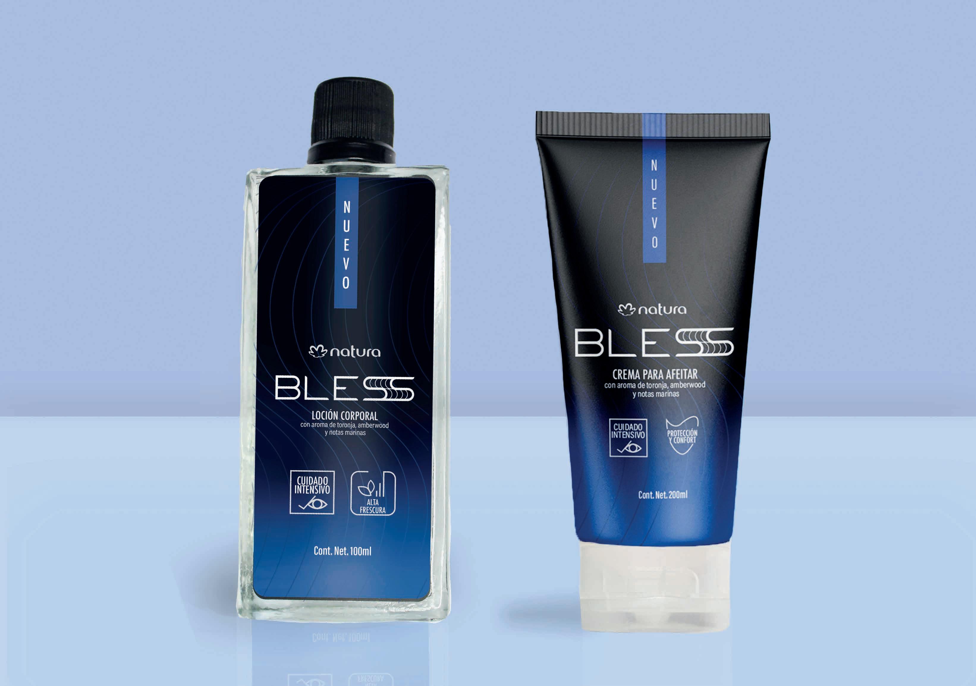 BLESS es una marca ficticia que pertenece a Natura, dirigida a un público de entre 30 y 45 años. Se diseñó desde un envase presible hasta un catálogo de productos, así como su respectivo manual de marca y envases.