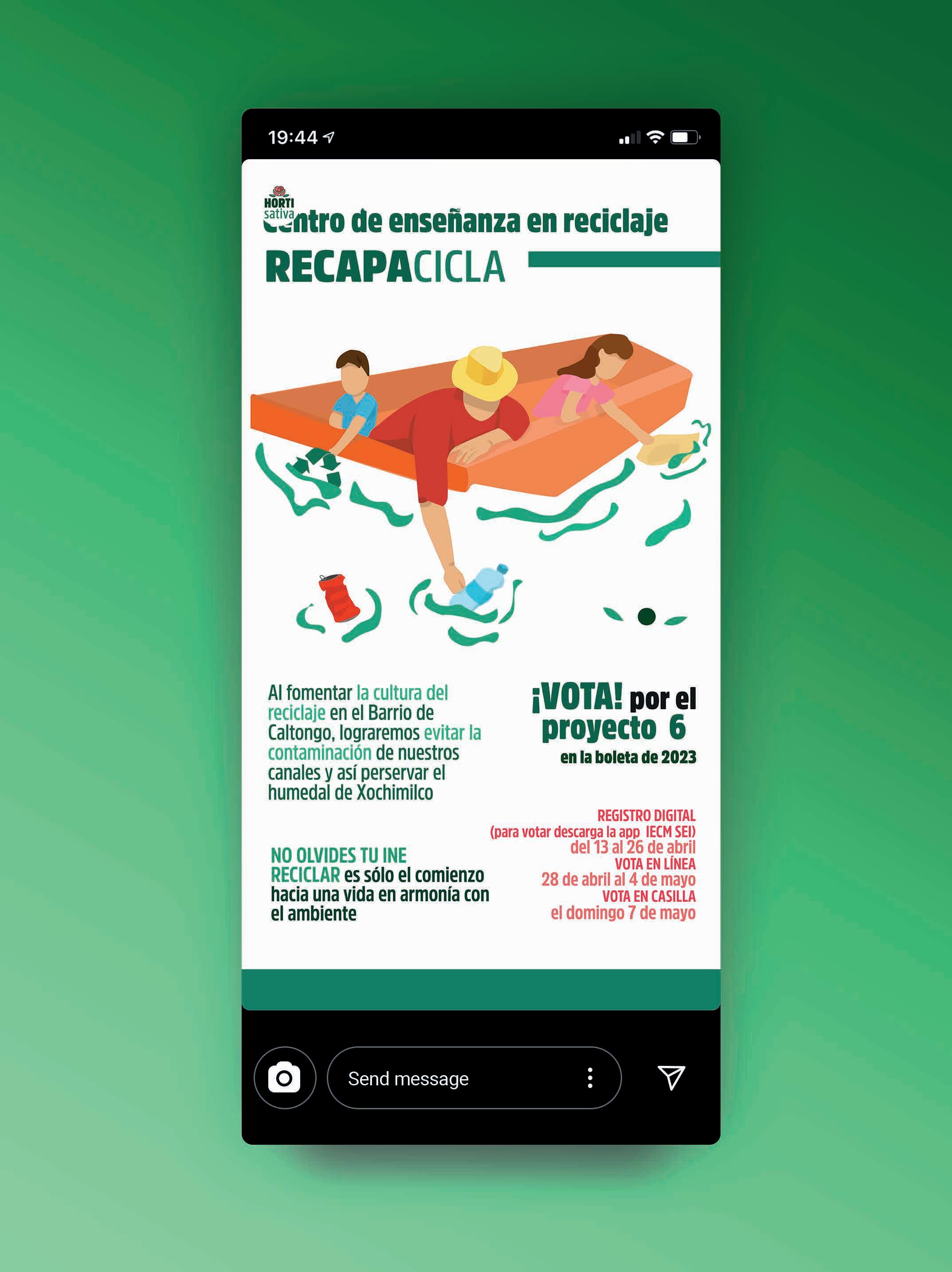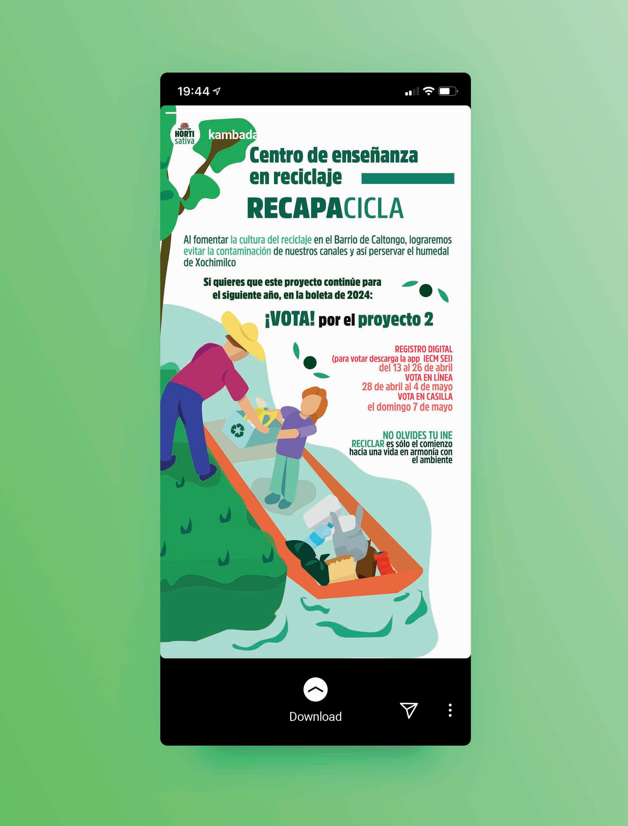 Se realizaron 3 diversas ilustraciones en relacionado a una campaña de presupuesto participativo en la zona de caltongo con el nombre RECAPACICLA que estaba a cargo de Horti Sativa.El concepto es una fusión entre la idea de chinanpa y reciclaje. Se obtuvieron 111 votos a favor.