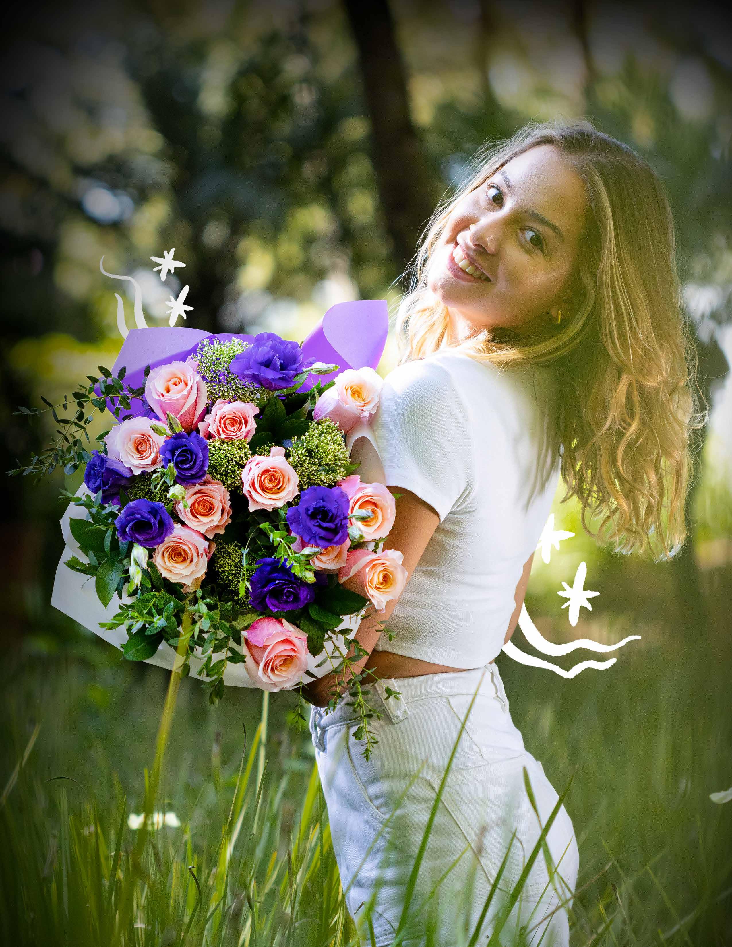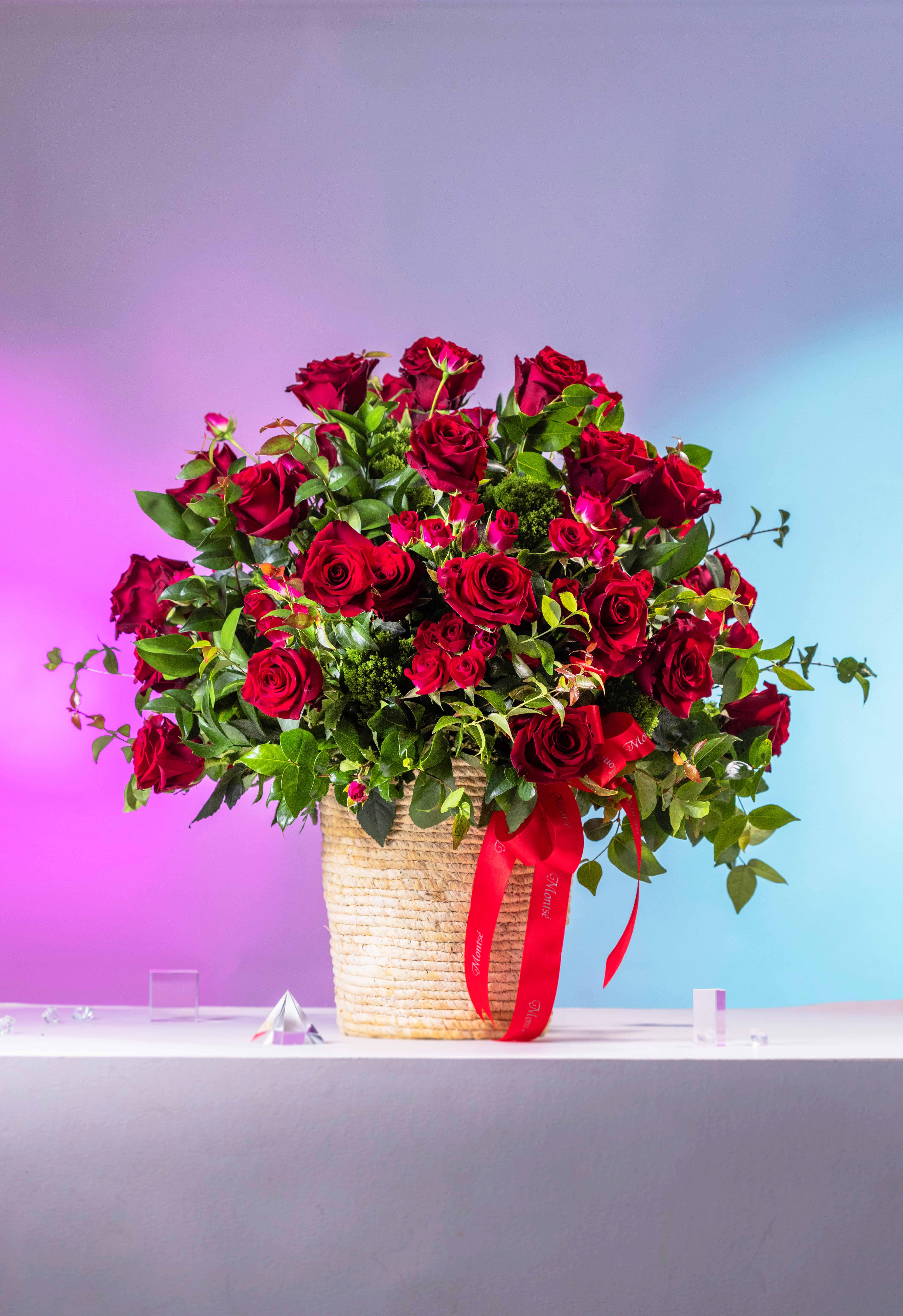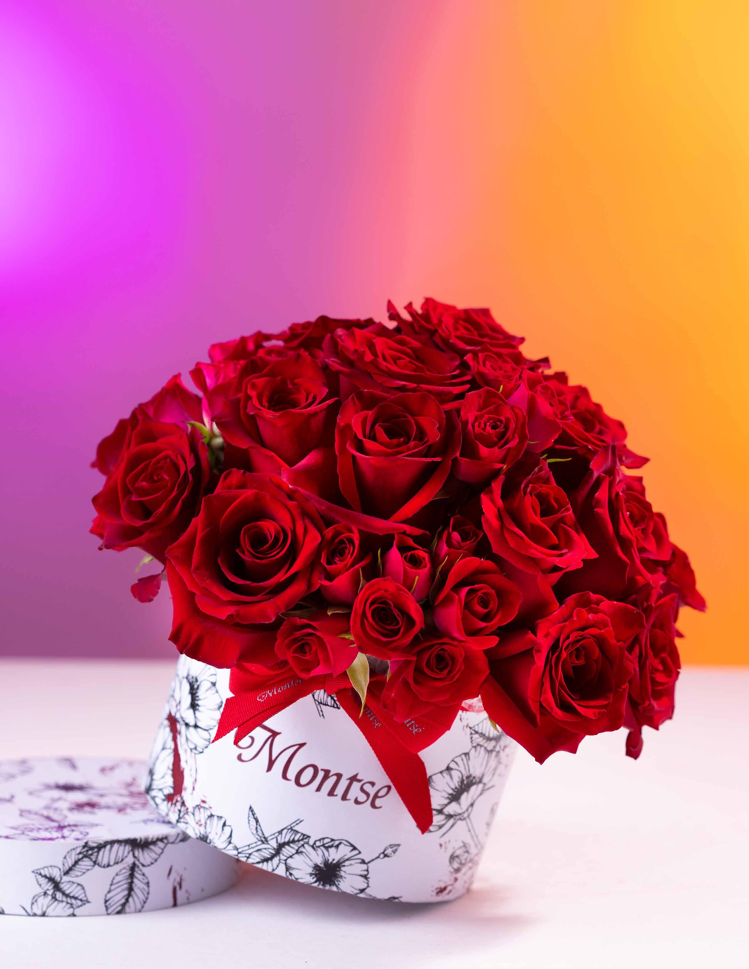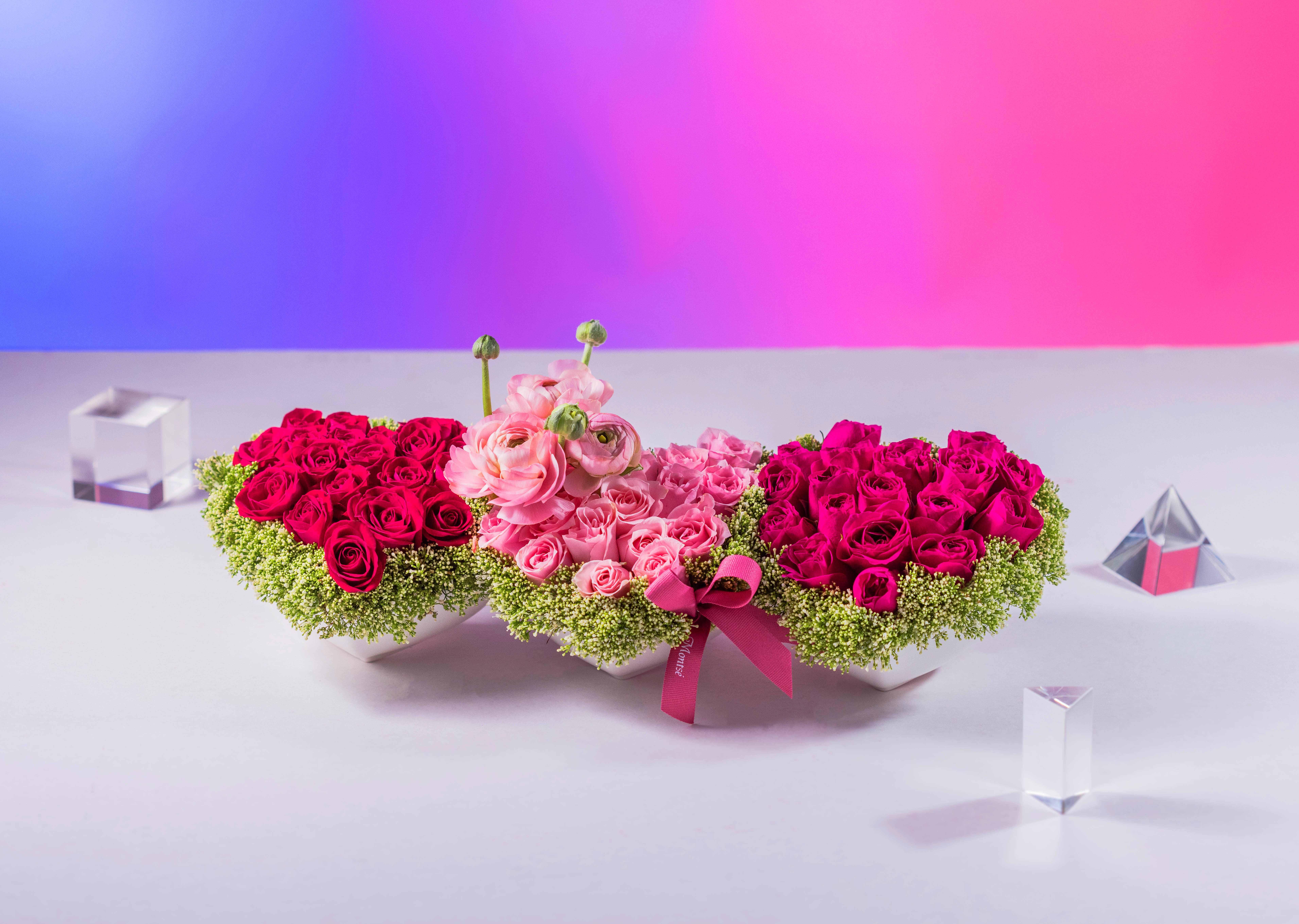 Arreglo de Spray roses y ranúnculos sobre base de cerámica en forma de corazón.