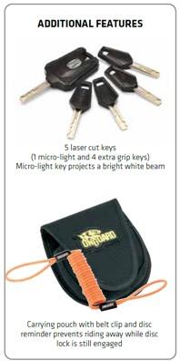 Large 55mm x 55mm opening fits many disc and rotor openings, and the heavy duty 14mm hardened steel shackle resists all attack from cutting, prying or jacking. X4P Quattro Bolt locking system secures the shackle on four sides for ultimate protection, and the included disc reminder helps prevent accidental drive offs.