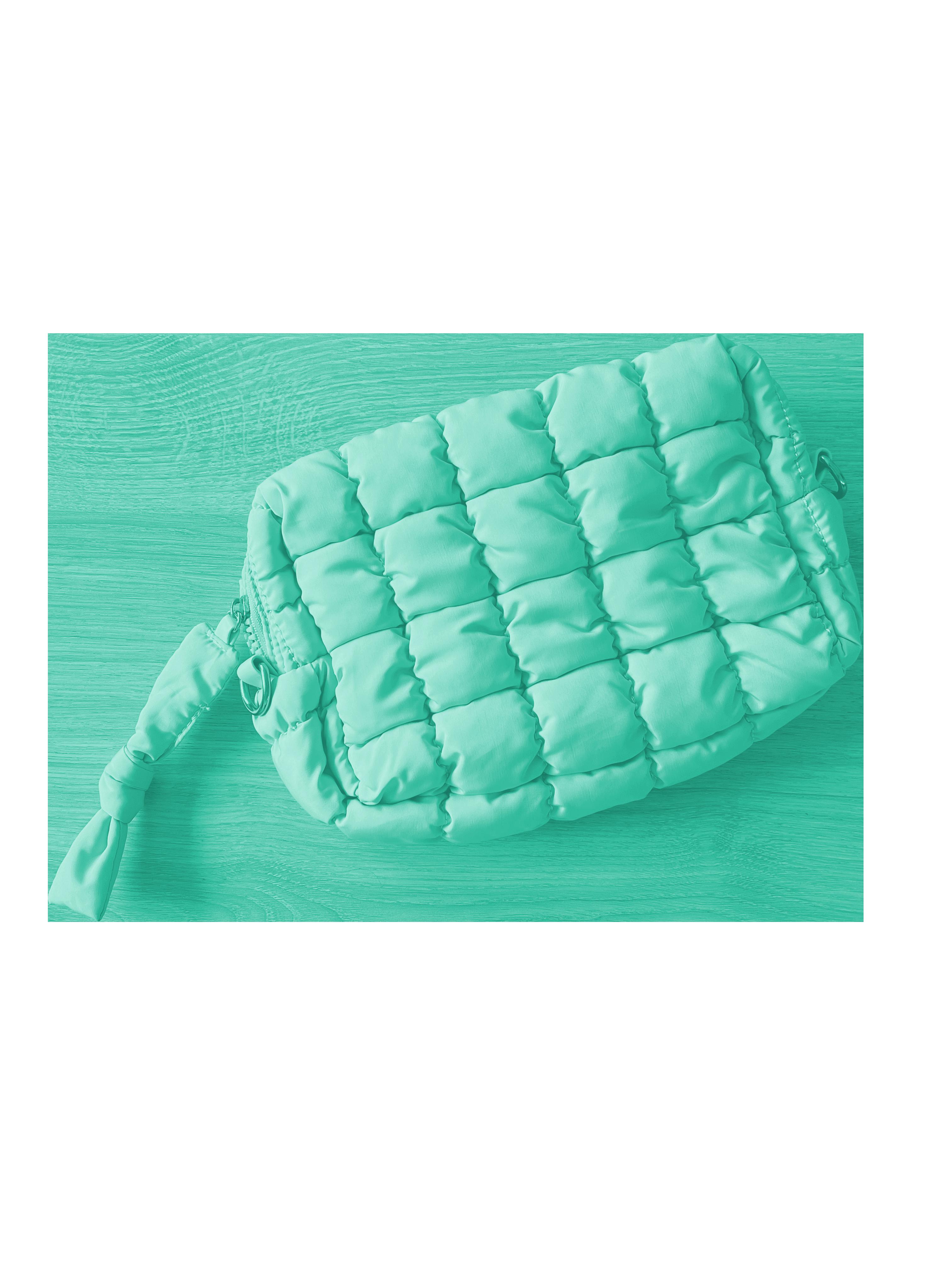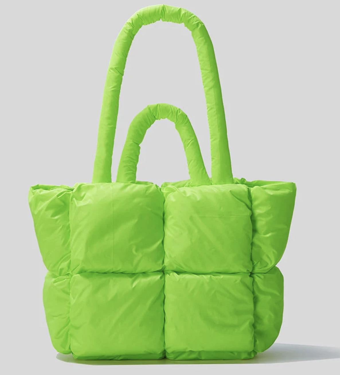 o material pufer tomou conta da moda, trazendo bolsas, necessaires e outros acessórios replicando a textura e as cores.
