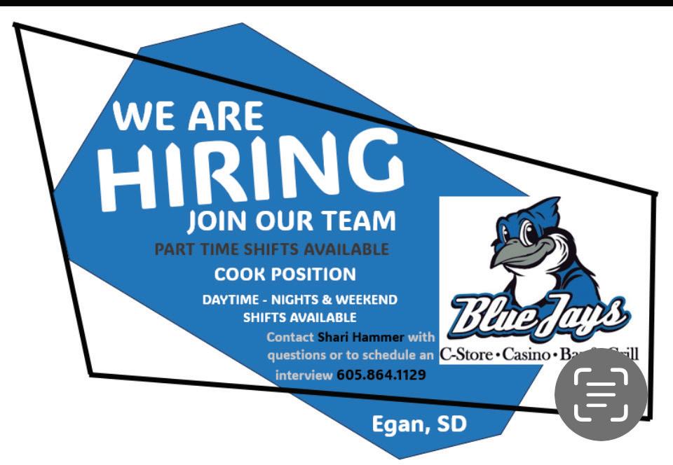BlueJays in Egan is Hiring for full time & part time cooking shifts nights and weekends with some day shifts available. Also hiring for C-Store Nights & Weekends. Contact Shari at 605-864-1129 to apply or stop in for an application. TF21