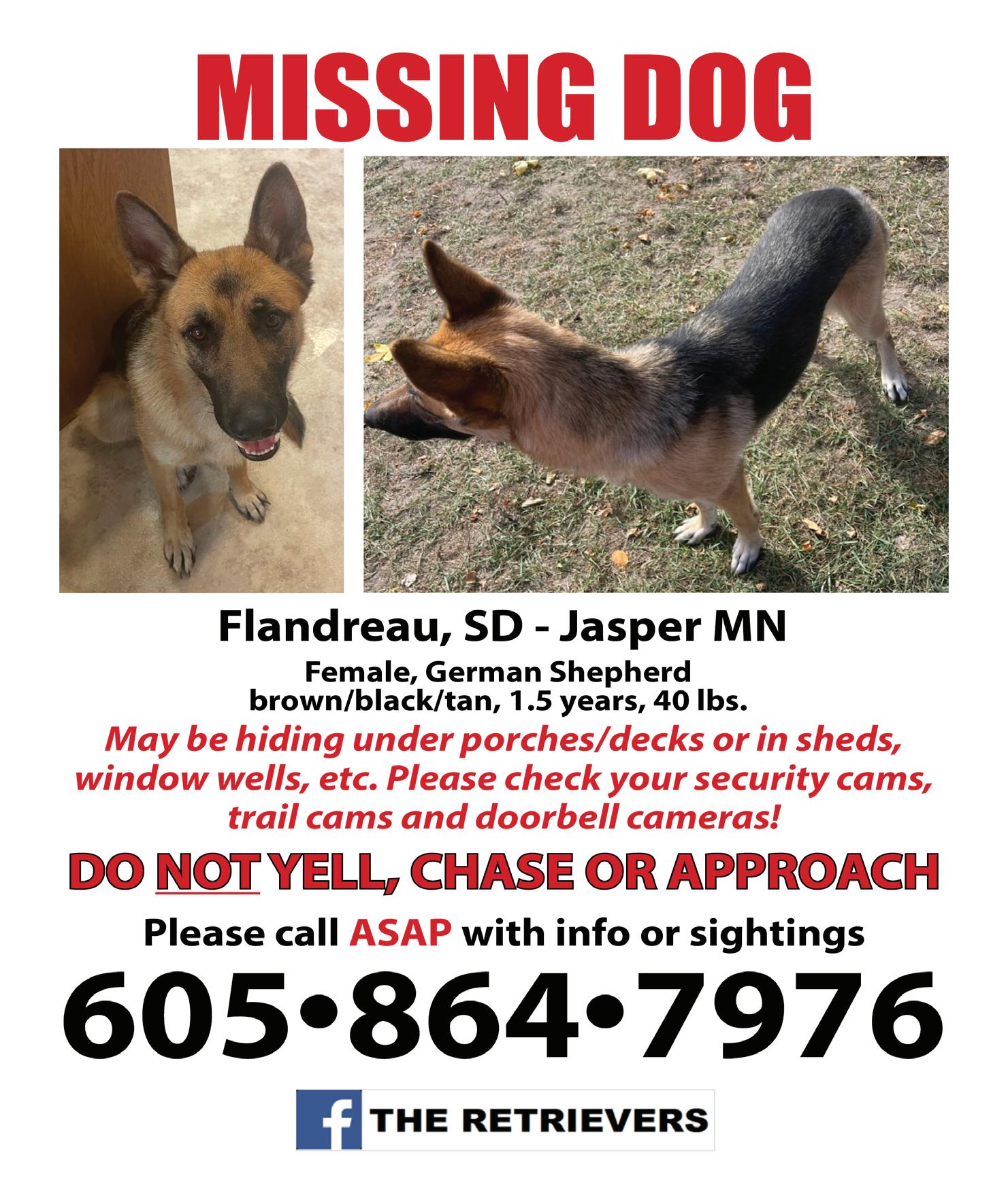 21. Female German Shephard. Her name is MIA! Black and Tan. No Collar. Call Jessica Blair at 605-864-7976.